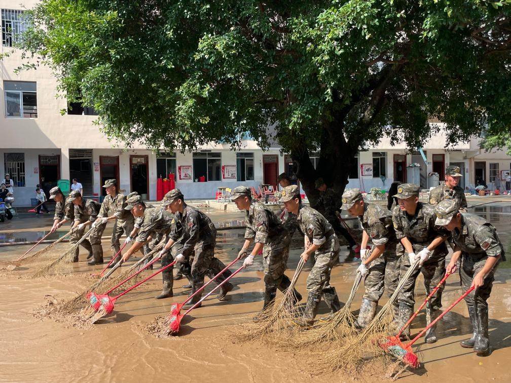 當日9時,廣西桂林水文中心解除洪水藍色預警。武警廣西總隊桂林支隊的140多名官兵分散在各個受災點進行清淤工作。在桂林市東江小學,40多名武警官兵正在幫助學校清淤,周邊的家長和學生也自發(fā)投入到學校的清理工作中。