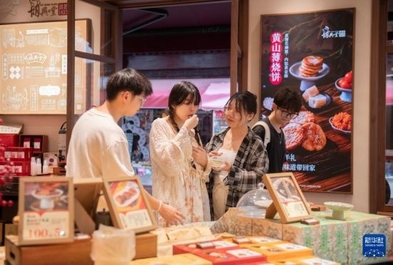 6月28日,在位于黃山市屯溪區(qū)的中國(guó)歷史文化名街屯溪老街,游客在一家店鋪試吃黃山特色小吃。