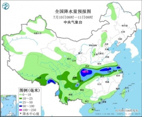 全國降水量預(yù)報圖(7月10日08時-11日08時)