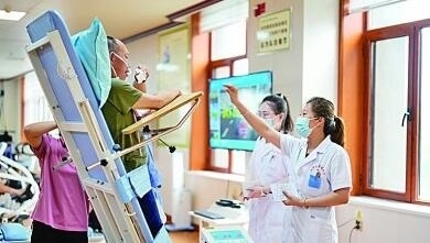 河北唐山市古冶區(qū)一家養(yǎng)老機(jī)構(gòu)的工作人員在指導(dǎo)老人進(jìn)行康復(fù)訓(xùn)練。新華社發(fā)