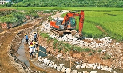 7月26日,湖南省洪江市巖垅鄉(xiāng)竹坪垅村,施工人員加緊修復(fù)被洪水沖毀的溪邊農(nóng)田???。楊錫建攝(人民視覺)