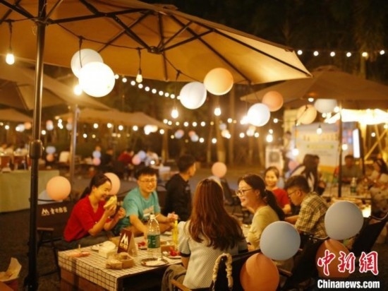 活動(dòng)現(xiàn)場(chǎng),搭建了露營(yíng)帳篷、休閑桌椅一字排開(kāi),布置了彩色氣球,提供甜品、水果、飲料等,燈光閃爍、晚風(fēng)習(xí)習(xí),氛圍甜蜜而浪漫。
