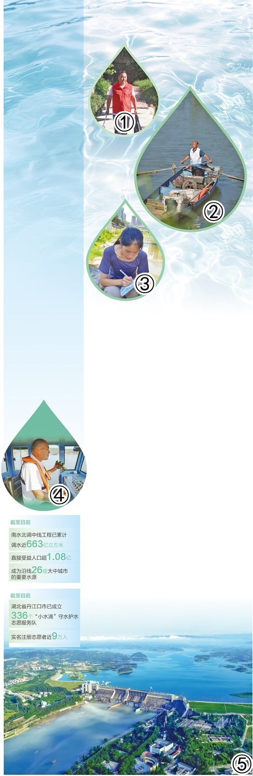 圖①:涂青海在巡線時(shí)撿拾垃圾。段 浩攝 圖②:蔣德新在巡護(hù)。丹江口市委宣傳部供圖 圖③:廖思盈在記錄水質(zhì)采樣數(shù)據(jù)。漢江師范學(xué)院供圖 圖④:肖安山在駕駛清漂船。鄖陽區(qū)委宣傳部供圖 圖⑤:丹江口水庫鳥瞰。丹江口市委宣傳部供圖 數(shù)據(jù)來源:中國南水北調(diào)集團(tuán)有限公司、丹江口市委宣傳部