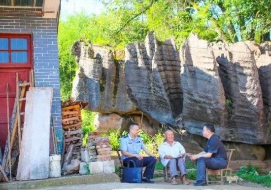 圖②:干警與村干部親切交談,交流“楓橋經(jīng)驗(yàn)”工作。