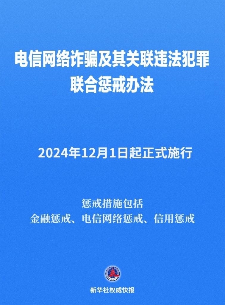 公安部11月26日召開(kāi)新聞發(fā)布會(huì),介紹公安部會(huì)同國(guó)家發(fā)展和改革委員會(huì)、工業(yè)和信息化部、中國(guó)人民銀行聯(lián)合印發(fā)《電信網(wǎng)絡(luò)詐騙及其關(guān)聯(lián)違法犯罪聯(lián)合懲戒辦法》,2024年12月1日起正式施行。
