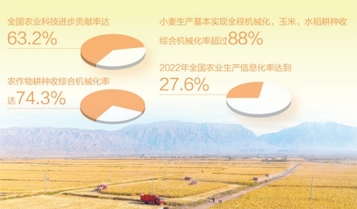 農(nóng)機(jī)為糧食生產(chǎn)護(hù)航,豐收更添底氣。目前,北斗導(dǎo)航大馬力拖拉機(jī)、氣力式高速精量播種機(jī)、乘坐式插秧機(jī)、植保無人機(jī)、玉米籽粒聯(lián)合收獲機(jī)等新型農(nóng)機(jī)廣泛應(yīng)用。全國(guó)農(nóng)業(yè)科技進(jìn)步貢獻(xiàn)率達(dá)63.2%,農(nóng)作物耕種收綜合機(jī)械化率達(dá)74.3%,小麥生產(chǎn)基本實(shí)現(xiàn)全程機(jī)械化,玉米、水稻耕種收綜合機(jī)械化率超過88%。