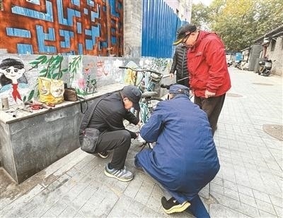 “幫把手公益服務(wù)隊”的于師傅(左二)為居民修理自行車。本報記者 霍旻含攝