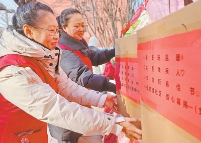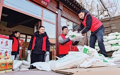 山東省青州市,工作人員將走訪慰問(wèn)困難群眾的愛(ài)心年貨裝車(chē)。