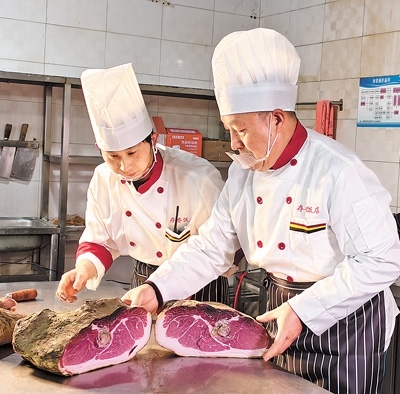 宣威市存香飯店,大廚徐天勇正忙著挑選食材,而烏金豬是制作宣威火腿的最佳原料?!半缰七^程也很重要,鹽的比例要恰到好處,多一分則咸,少一分則不夠味,經(jīng)過兩三年發(fā)酵,火腿就可以達(dá)到生吃的標(biāo)準(zhǔn)了?!毙焯煊掠霉轻樰p輕插入火腿的上、中、下部,火腿肉質(zhì)清香撲鼻,“就是它了。”