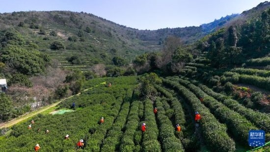 3月17日,在蘇州市吳中區(qū)西山國家現(xiàn)代農業(yè)示范園金海華碧水緣茶葉基地,采茶工在碧螺春古茶園采茶(無人機照片)。