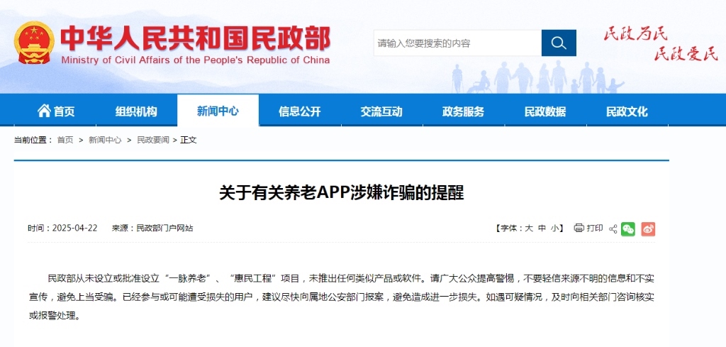 4月22日,民政部發(fā)布公告表示,民政部從未設立或批準設立“一脈養(yǎng)老”“惠民工程”項目,未推出任何類似產(chǎn)品或軟件。請廣大公眾提高警惕,不要輕信來源不明的信息和不實宣傳,避免上當受騙。已經(jīng)參與或可能遭受損失的用戶,建議盡快向?qū)俚毓膊块T報案,避免造成進一步損失。如遇可疑情況,及時向相關部門咨詢核實或報警處理。(記者朱高祥)