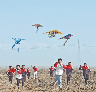 志愿者服務(wù)隊隊員帶著學(xué)生們一起放風(fēng)箏。