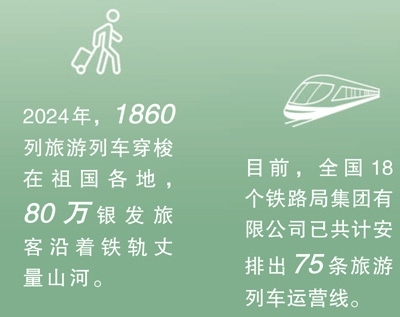 今年2月,商務(wù)部、文化和旅游部、中國國家鐵路集團(tuán)有限公司等9單位聯(lián)合發(fā)布《關(guān)于增開銀發(fā)旅游列車促進(jìn)服務(wù)消費發(fā)展的行動計劃》,指出要擴(kuò)容旅游列車線路和產(chǎn)品,豐富銀發(fā)旅游列車產(chǎn)品供給,建立品質(zhì)型、舒適型、普惠型產(chǎn)品體系。目前,全國18個鐵路局集團(tuán)有限公司已共計安排出75條旅游列車運(yùn)營線。一趟趟銀發(fā)列車如春日繁花次第綻放,為老年人鋪就通往詩與遠(yuǎn)方的旅途,更以流動的風(fēng)景線激活沿線文旅消費,為推動經(jīng)濟(jì)高質(zhì)量發(fā)展注入“銀發(fā)”新動能。