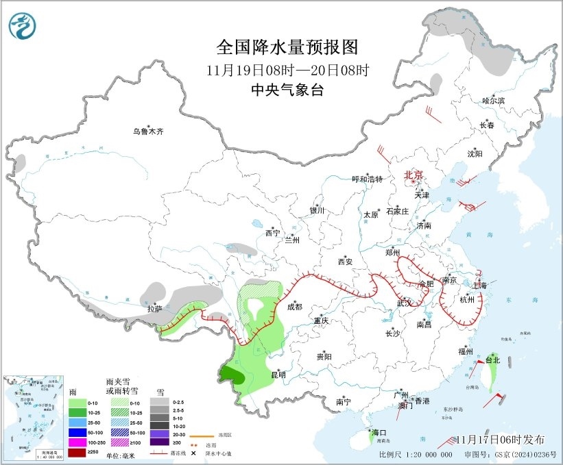 全國降水量預(yù)報(bào)圖(11月19日08時(shí)-20日08時(shí))