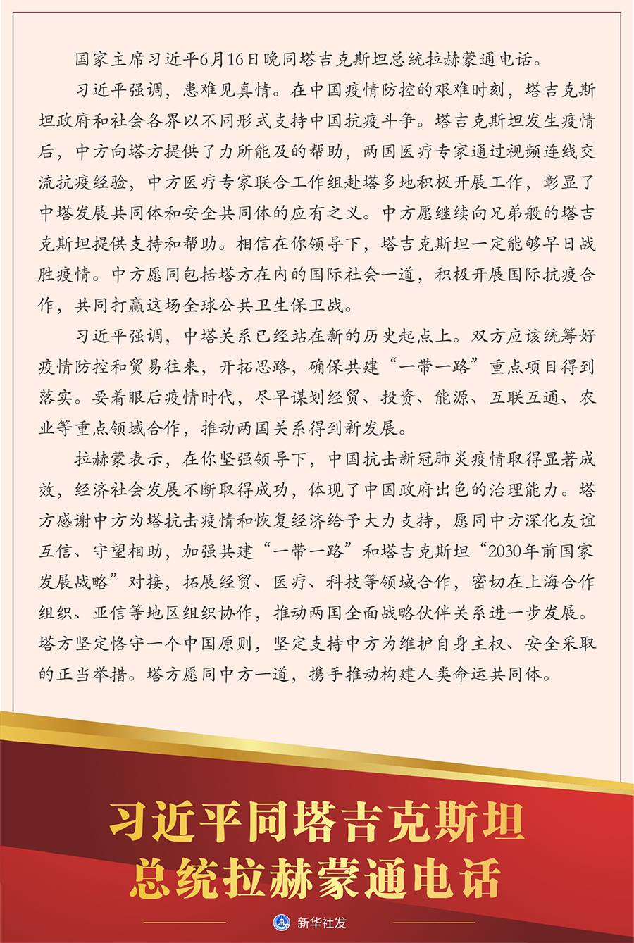 習近平強調(diào),患難見真情。在中國疫情防控的艱難時刻,塔吉克斯坦政府和社會各界以不同形式支持中國抗疫斗爭。塔吉克斯坦發(fā)生疫情后,中方向塔方提供了力所能及的幫助,兩國醫(yī)療專家通過視頻連線交流抗疫經(jīng)驗,中方醫(yī)療專家聯(lián)合工作組赴塔多地積極開展工作,彰顯了中塔發(fā)展共同體和安全共同體的應(yīng)有之義。中方愿繼續(xù)向兄弟般的塔吉克斯坦提供支持和幫助。相信在你領(lǐng)導下,塔吉克斯坦一定能夠早日戰(zhàn)勝疫情。中方愿同包括塔方在內(nèi)的國際社會一道,積極開展國際抗疫合作,共同打贏這場全球公共衛(wèi)生保衛(wèi)戰(zhàn)。