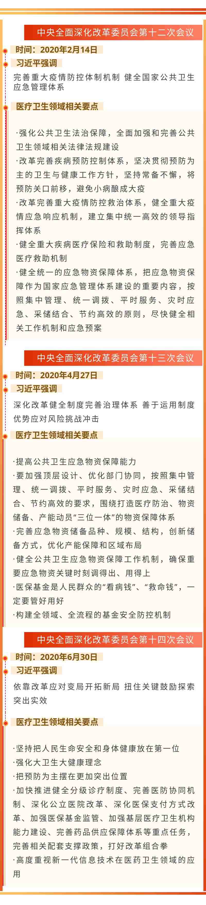 醫(yī)療保障制度和體系,是中央深改委會議長期關注的內容。新冠肺炎疫情來襲后,中央針對因疫情暴露出來的醫(yī)療衛(wèi)生體系的短板和不足,立足當前、放眼長遠,圍繞這一重大改革主題,作了出全面動員、全面部署。