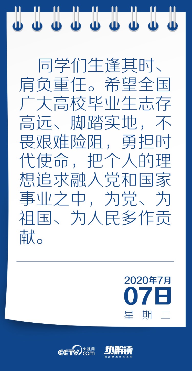 習(xí)近平總書記在回信中高度肯定了同學(xué)們到邊疆基層工作的選擇,并對(duì)廣大高校畢業(yè)生提出殷切期望:“希望全國(guó)廣大高校畢業(yè)生志存高遠(yuǎn)、腳踏實(shí)地,不畏艱難險(xiǎn)阻,勇?lián)鷷r(shí)代使命,把個(gè)人的理想追求融入黨和國(guó)家事業(yè)之中,為黨、為祖國(guó)、為人民多作貢獻(xiàn)?!?/p>