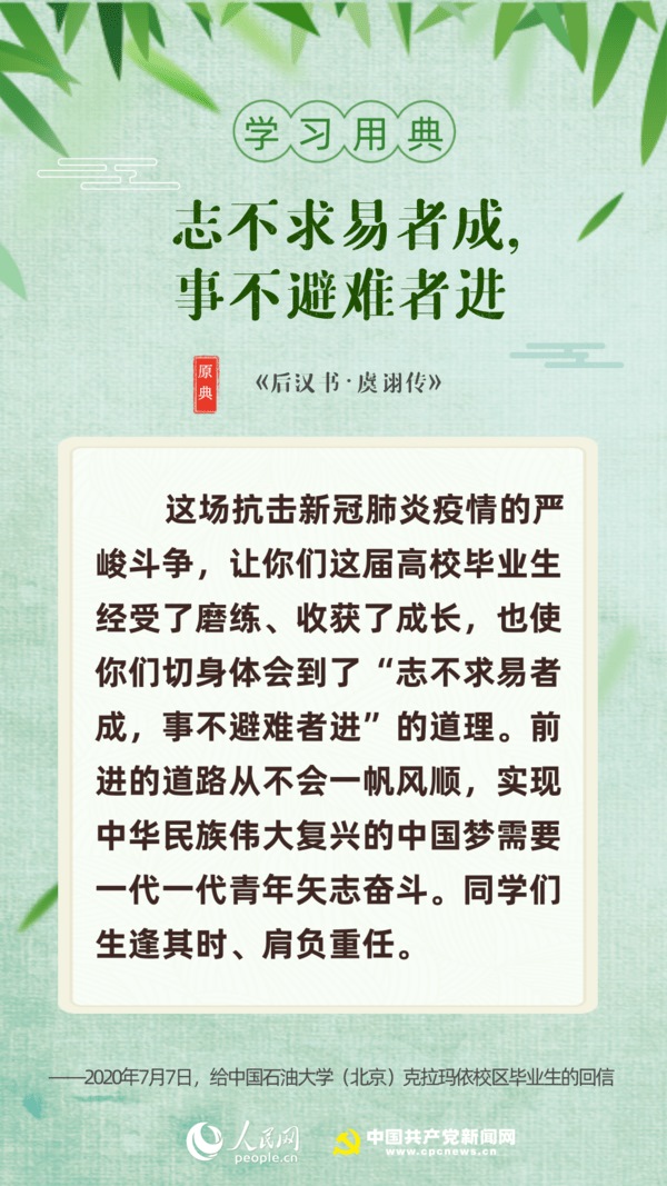 【編者按】“志不求易者成,事不避難者進。”近日,習(xí)近平總書記給中國石油大學(xué)(北京)克拉瑪依校區(qū)畢業(yè)生回信,對廣大高校畢業(yè)生提出殷切期望?!叭松谇冢趧t不匱”“積土而為山,積水而為?!薄陙?,習(xí)近平多次引用詩句典故,激勵包含廣大青年在內(nèi)的全黨全國各族人民拼搏奮進、埋頭苦干。正值“戰(zhàn)疫”“戰(zhàn)貧”關(guān)鍵時刻,人民網(wǎng)·中國共產(chǎn)黨新聞網(wǎng)與您一起回顧習(xí)近平講話中關(guān)于“奮斗”的10個名句。