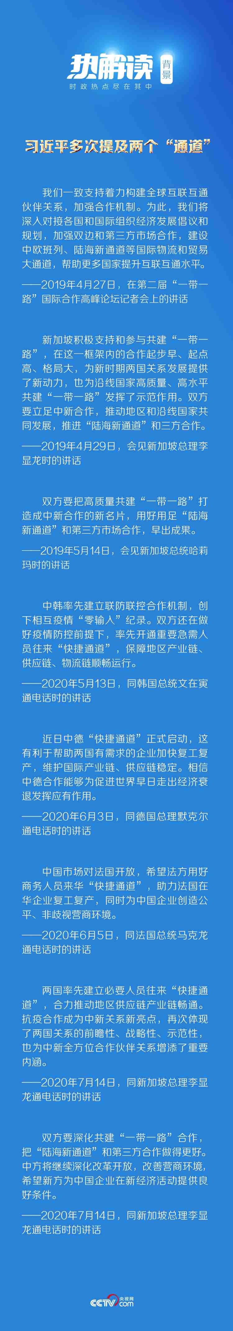 7月14日,習(xí)近平主席同新加坡總理李顯龍通電話。他在通話中表示,“疫情發(fā)生以來,中新兩國(guó)政府和各界互施援手,守望相助”,并特別提到了“快捷通道”和“陸海新通道”這兩條“通道”。