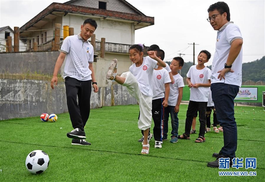 在江西省貴溪市金屯鎮(zhèn)金屯村渡坊村小組,志愿者和留守兒童一起進行體育活動(5月27日攝)。新華社記者萬象攝