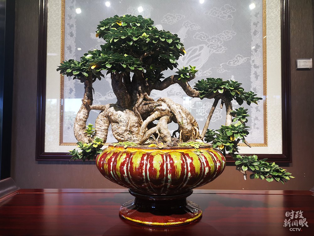 △楓溪瓷燒制技藝是國家級非物質(zhì)文化遺產(chǎn)之一,這是作品《榕樹盆景》。(總臺央視記者張曉鵬拍攝)