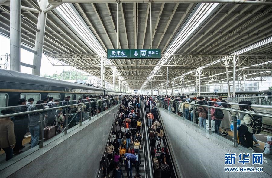 10月7日,長(zhǎng)假臨近尾聲,貴陽(yáng)火車站迎來(lái)旅客返程高峰。這是旅客在貴陽(yáng)火車站準(zhǔn)備出站。新華社記者陶亮攝