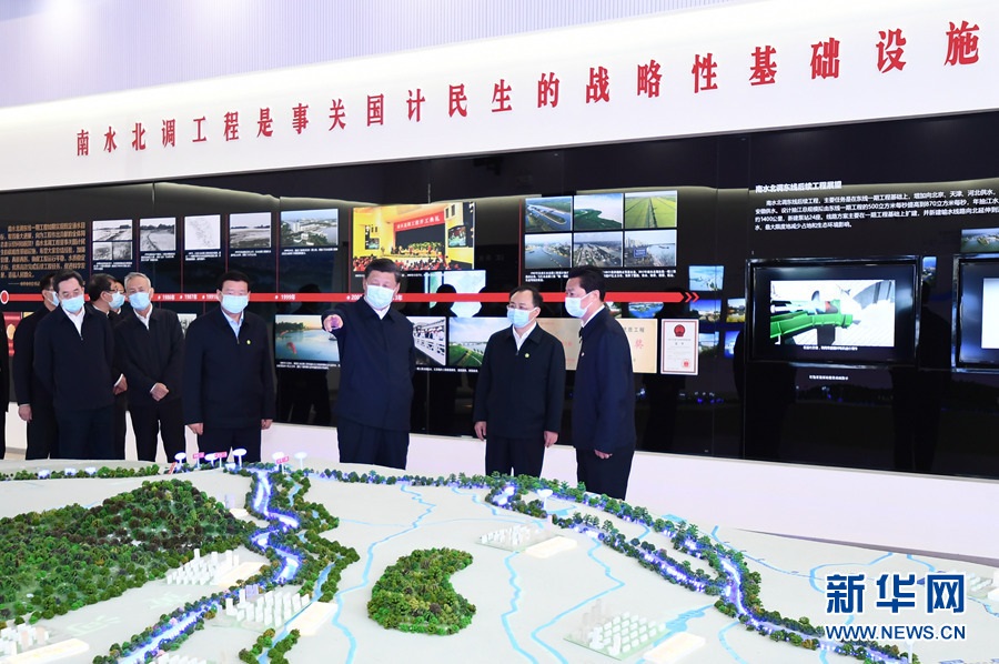 一個大型沙盤模型直觀地呈現(xiàn)了中國大地上水資源大范圍大規(guī)??鐓^(qū)域調配的壯闊景象,習近平總書記駐足凝望——