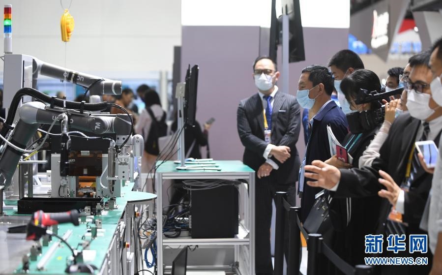 2020年11月6日,在進博會技術裝備展區(qū),人們在西門子展臺觀看人機協(xié)作的智能化單元生產線。新華社記者 李任滋 攝