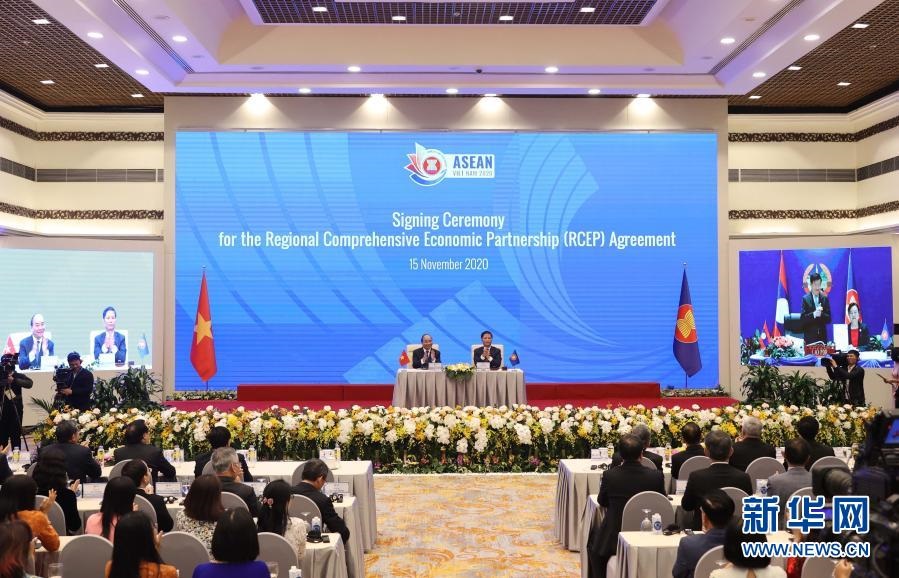 這是2020年11月15日在越南首都河內拍攝的區(qū)域全面經濟伙伴關系協(xié)定(RCEP)簽署儀式現(xiàn)場。新華社/越通社