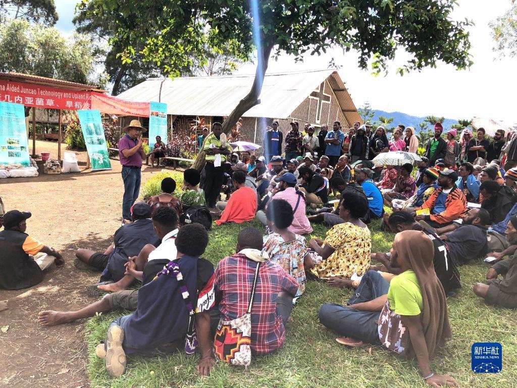 2020年12月15日,中國援巴布亞新幾內(nèi)亞菌草旱稻項目專家組組長林應(yīng)興(戴草帽者)在巴布亞新幾內(nèi)亞東高地省中國援助巴新菌草和旱稻技術(shù)項目第9期培訓(xùn)班上授課。新華社發(fā)
