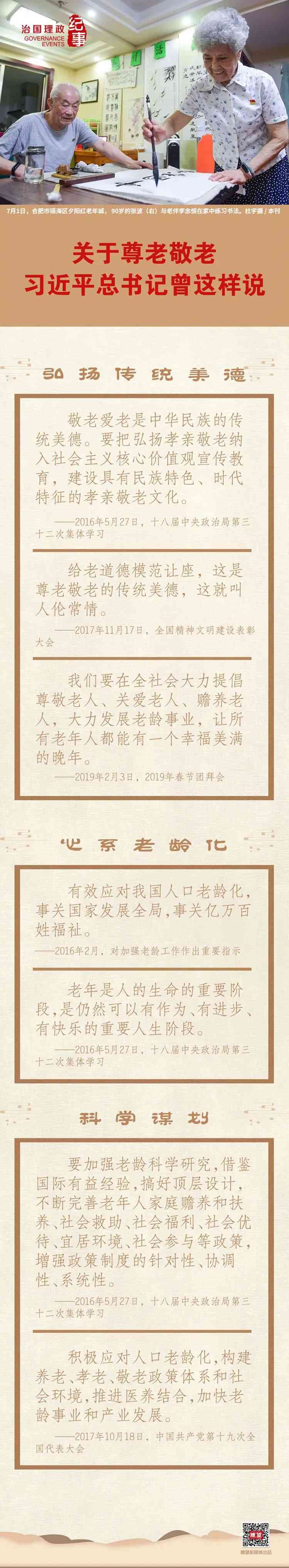 “古人講,‘夫孝,德之本也’。自古以來,中國人就提倡孝老愛親,倡導(dǎo)老吾老以及人之老、幼吾幼以及人之幼。我國已經(jīng)進入老齡化社會。讓老年人老有所養(yǎng)、老有所依、老有所樂、老有所安,關(guān)系社會和諧穩(wěn)定?!?019年春節(jié)團拜會上,習近平總書記這樣講述他心中的“孝”與尊老敬老傳統(tǒng)美德。