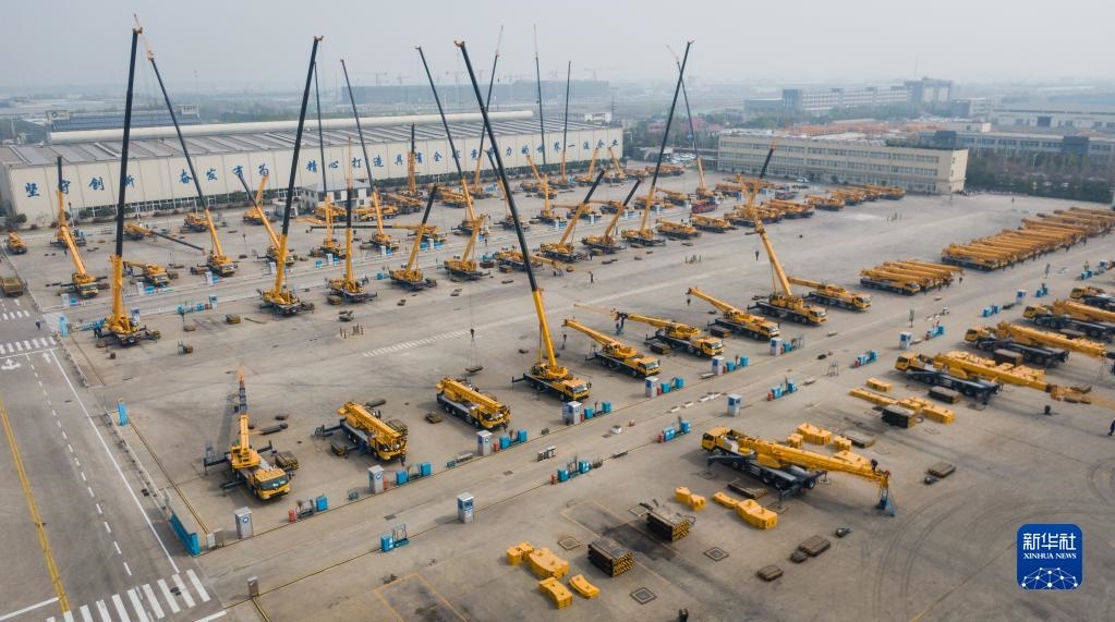 這是2019年4月4日在徐工集團(tuán)徐州重型機(jī)械有限公司拍攝的調(diào)試中的起重機(jī)(無人機(jī)照片)。新華社記者 李響 攝