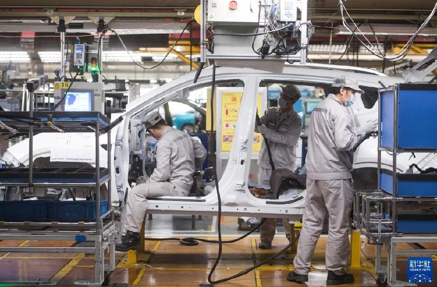 2020年3月24日,工人在湖北武漢東風(fēng)乘用車公司工廠總裝車間的流水線上作業(yè)。2020年3月下旬左右,武漢各企業(yè)開始陸續(xù)復(fù)工復(fù)產(chǎn)。新華社記者 肖藝九