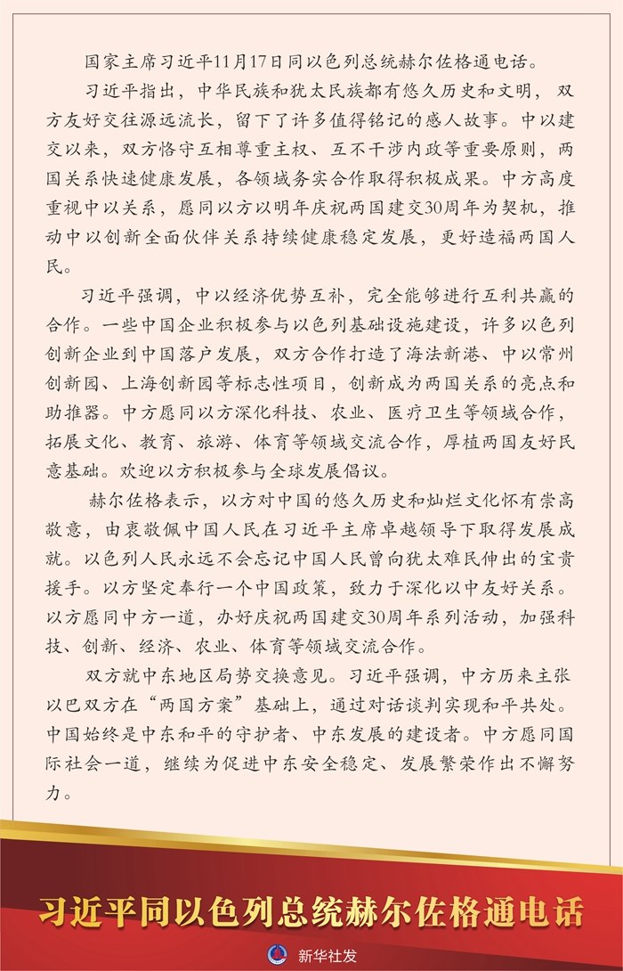 新華社北京11月17日電國家主席習近平11月17日同以色列總統赫爾佐格通電話。