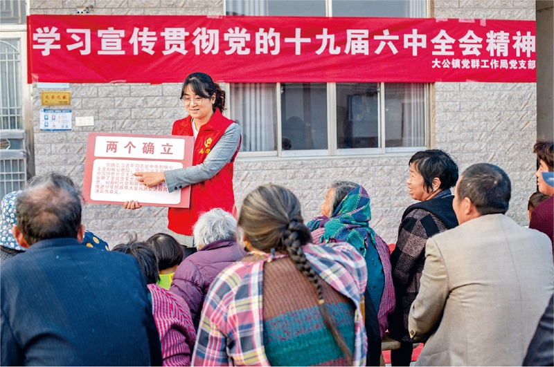 2021年11月18日,江蘇省南通市海安市大公鎮(zhèn)黨員志愿者在常河村12組向村民宣傳黨的十九屆六中全會精神,用老百姓聽得懂、能領會的方式將全會精神傳達到基層。人民視覺翟慧勇/攝