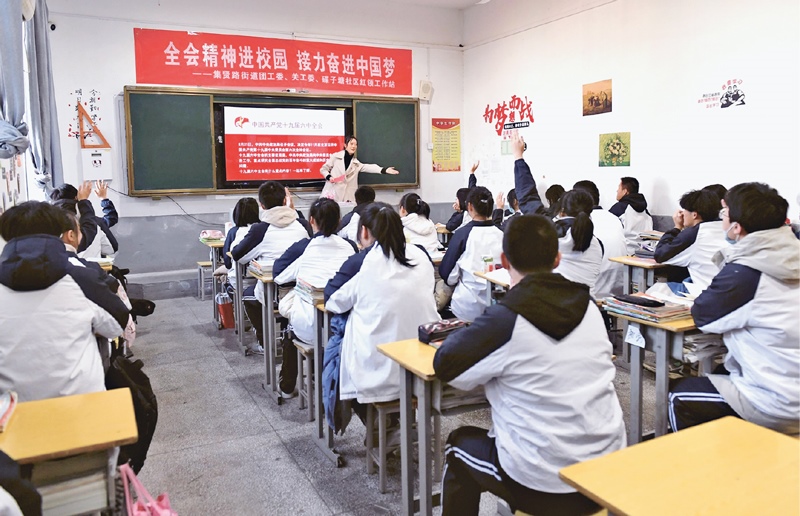 2021年11月24日,安徽省安慶市大觀區(qū)集賢路街道團工委、碟子塘社區(qū)紅領工作站聯(lián)合開展黨的十九屆六中全會精神宣講進校園活動。中新社發(fā)項順平/攝