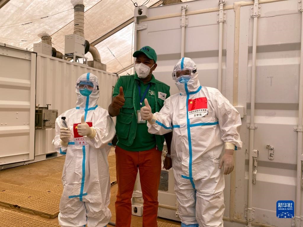 2020年9月2日,在幾內(nèi)亞首都科納克里一個(gè)核酸檢測(cè)取樣點(diǎn),中國(guó)抗疫醫(yī)療專家組成員與當(dāng)?shù)毓ぷ魅藛T合影。新華社發(fā)(專家組供圖)