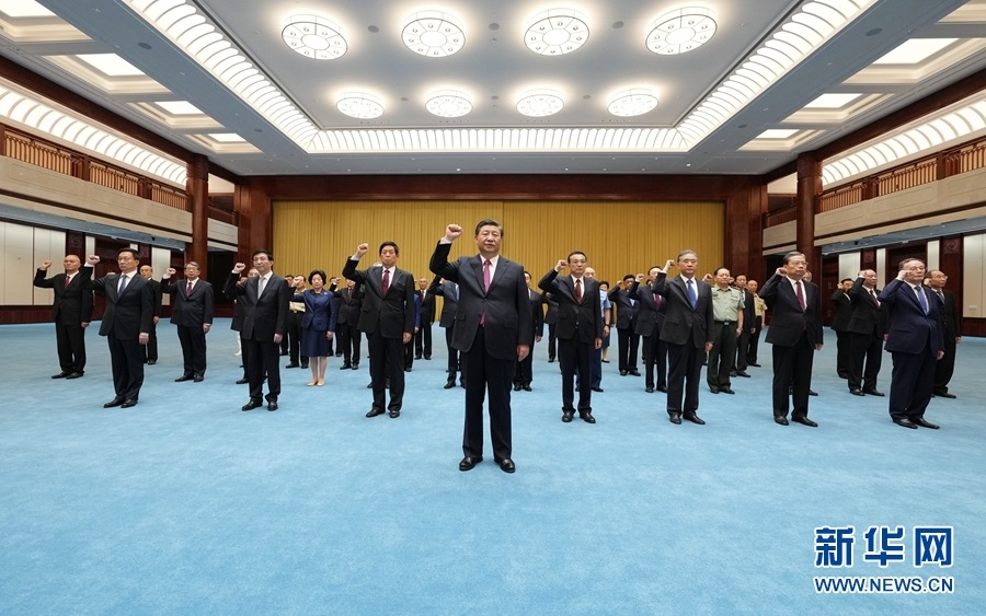 2021年6月18日,黨和國家領導人習近平、李克強、栗戰(zhàn)書、汪洋、王滬寧、趙樂際、韓正、王岐山等在中國共產(chǎn)黨歷史展覽館參觀“‘不忘初心、牢記使命’中國共產(chǎn)黨歷史展覽”。這是參觀結束后,習近平帶領黨員領導同志一起重溫入黨誓詞。新華社記者 李學仁 攝