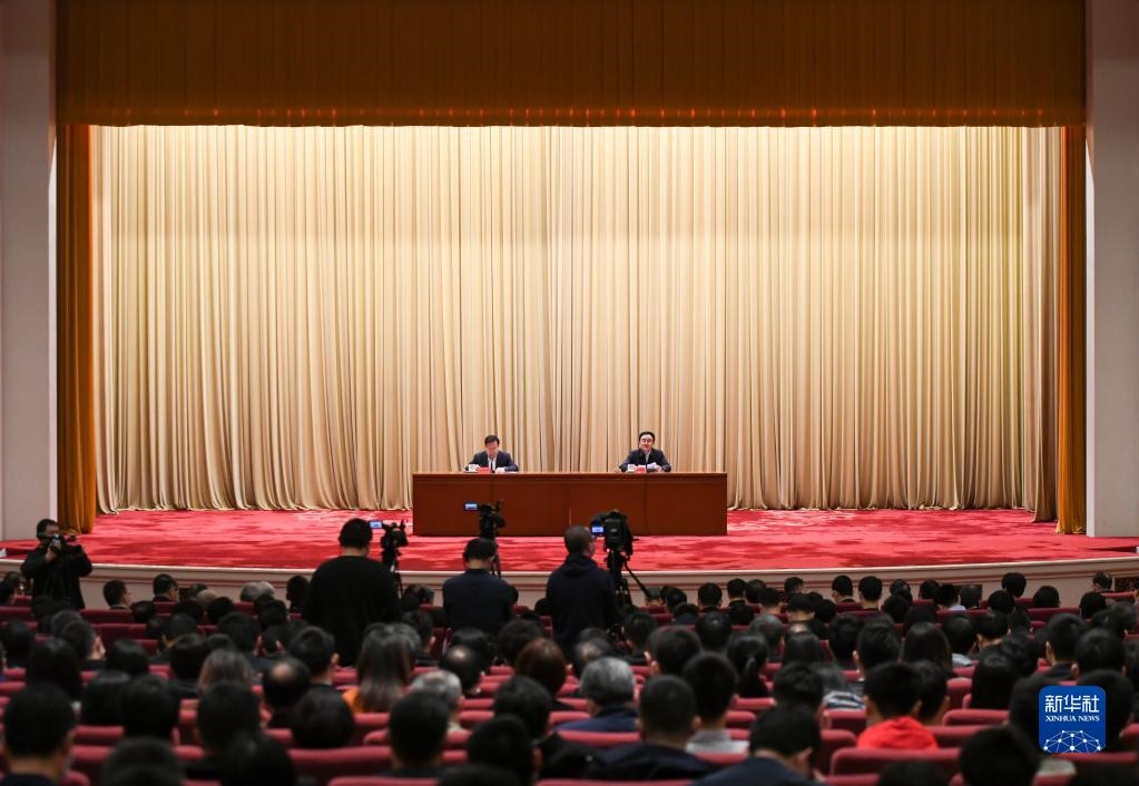 2021年3月16日,黨史學習教育中央宣講團首場報告會在北京舉行。這是中央宣講團成員、中央黨史和文獻研究院院長曲青山(右)在報告會上作宣講報告。新華社記者陳曄華攝