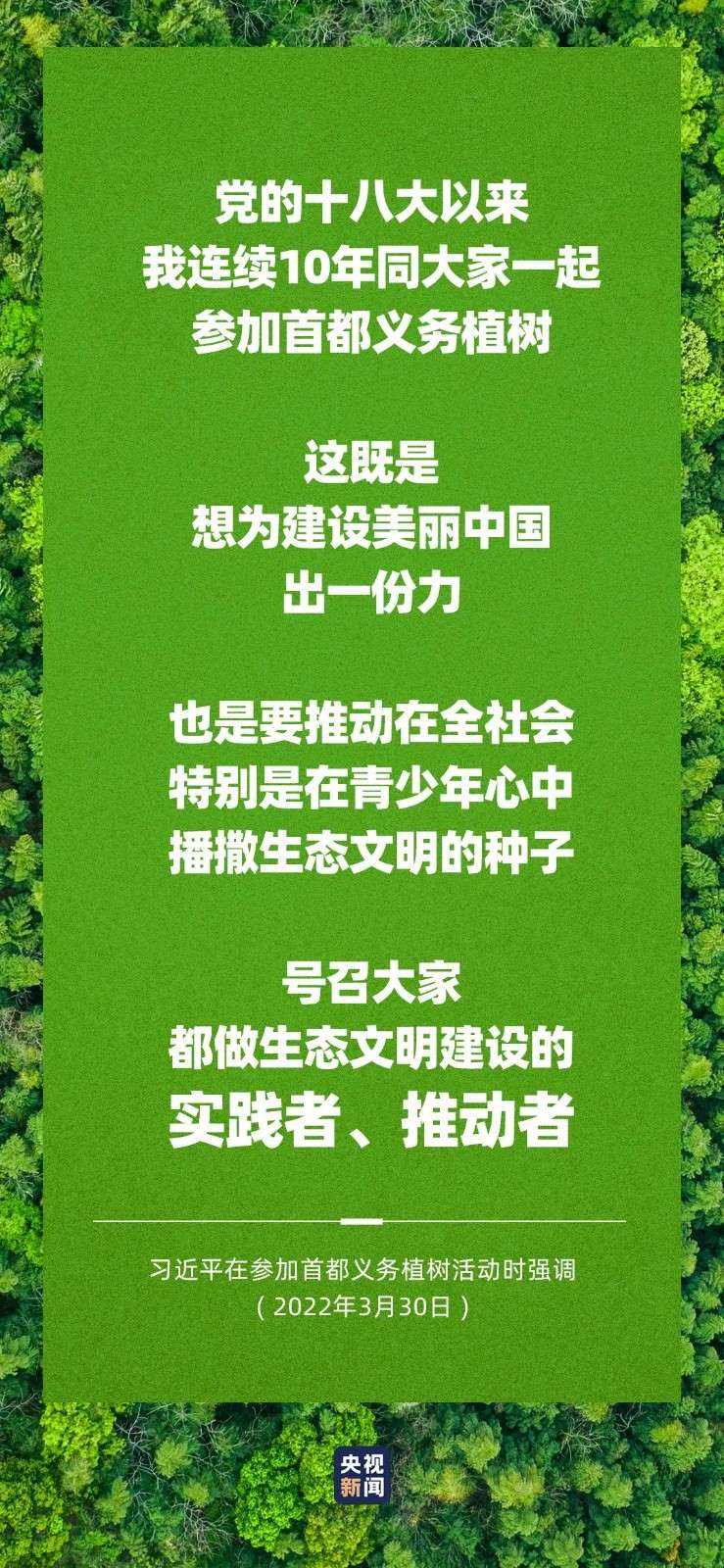 中共中央總書記、國(guó)家主席、中央軍委主席習(xí)近平3月30日在參加首都義務(wù)植樹活動(dòng)時(shí)強(qiáng)調(diào),黨的十八大以來,我連續(xù)10年同大家一起參加首都義務(wù)植樹,這既是想為建設(shè)美麗中國(guó)出一份力,也是要推動(dòng)在全社會(huì)特別是在青少年心中播撒生態(tài)文明的種子,號(hào)召大家都做生態(tài)文明建設(shè)的實(shí)踐者、推動(dòng)者,持之以恒,久久為功,讓我們的祖國(guó)天更藍(lán)、山更綠、水更清、生態(tài)環(huán)境更美好。