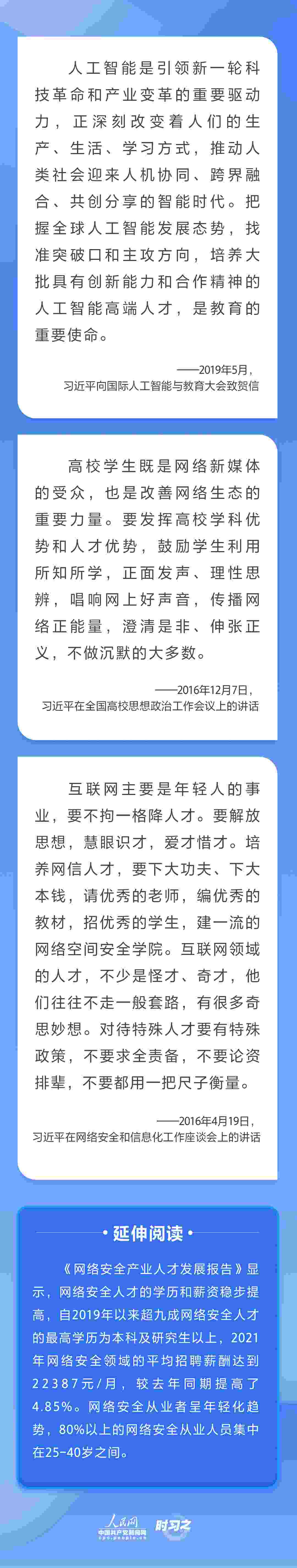 “網(wǎng)信領(lǐng)域是技術(shù)密集型、創(chuàng)新密集型領(lǐng)域,千軍易得、一將難求,必須聚天下英才而用之?!秉h的十八大以來(lái),習(xí)近平總書記多次就網(wǎng)信事業(yè)發(fā)展作出重要論述,并將抓好人才工作擺在治國(guó)理政的重要位置,為新時(shí)代網(wǎng)信人才工作和網(wǎng)信人才事業(yè)發(fā)展指明了前進(jìn)方向。