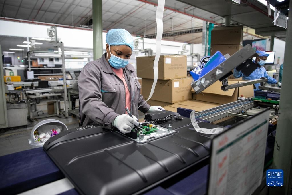 2022年6月1日,當(dāng)?shù)貑T工在南非開普敦海信南非工業(yè)園的電視機(jī)生產(chǎn)線上工作。新華社記者呂天然攝