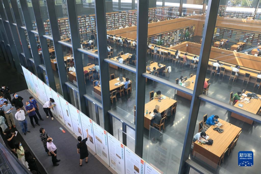 在北京國(guó)家圖書館,工作人員在介紹“經(jīng)典,予生活以詩(shī)意——‘文津經(jīng)典誦讀’十周年主題展”(2022年9月7日攝)。新華社記者殷剛攝