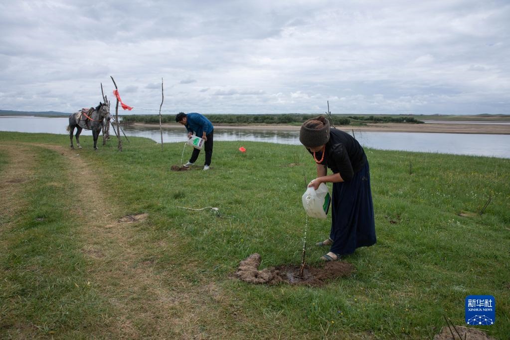 四川省若爾蓋縣麥溪鄉(xiāng)嘎沙村巡河隊(duì)的村民在黃河邊給新種的柳樹澆水(2022年7月26日攝)。新華社記者 江宏景 攝