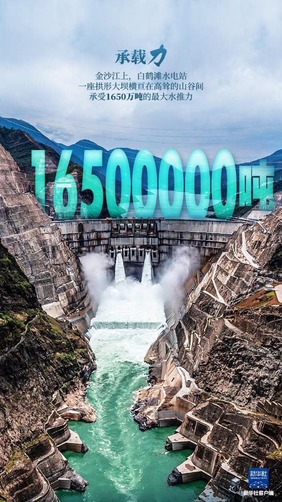 金沙江上,白鶴灘水電站,一座拱形大壩橫亙?cè)诟呗柕纳焦乳g,承受1650萬(wàn)噸的最大水推力。