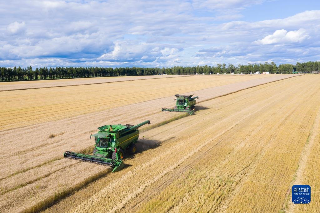 聯(lián)合收割機(jī)在黑龍江北大荒集團(tuán)紅星農(nóng)場(chǎng)有限公司田間收獲小麥(2022年8月10日攝,無人機(jī)照片)。新華社記者 謝劍飛 攝