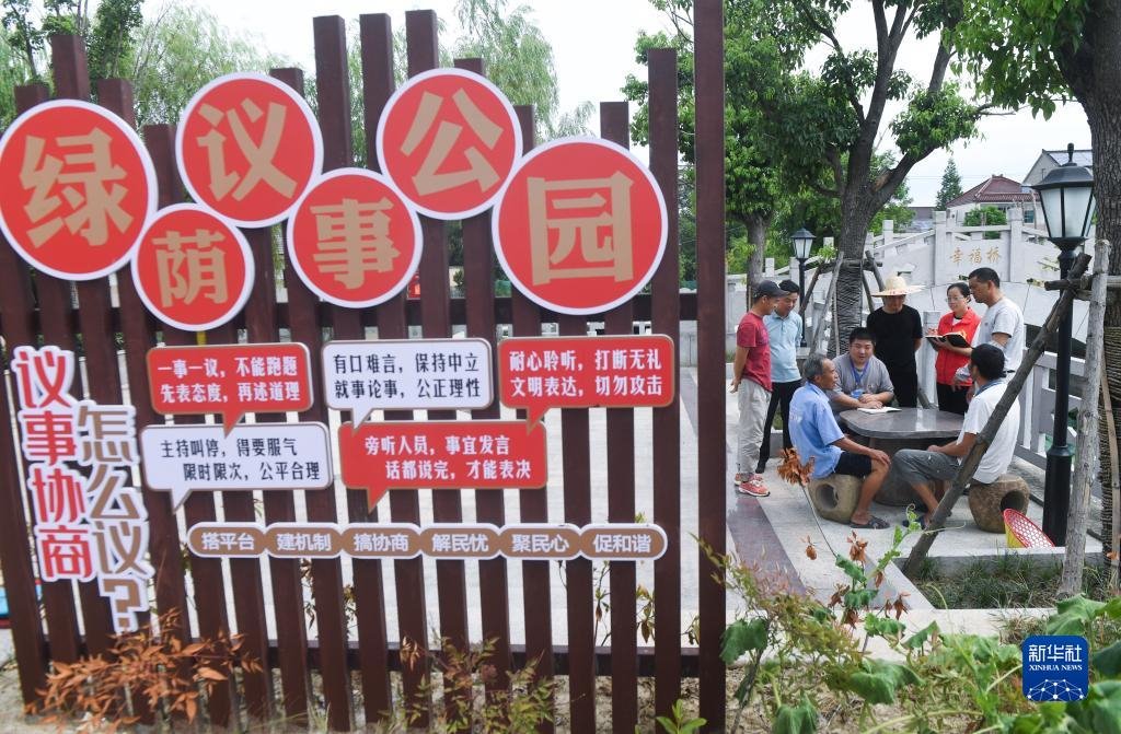 在浙江省湖州市長(zhǎng)興縣呂山鄉(xiāng)龍溪村的議事公園內(nèi),田園議事會(huì)成員開(kāi)展討論協(xié)商(2022年7月21日攝)。新華社記者 徐昱 攝