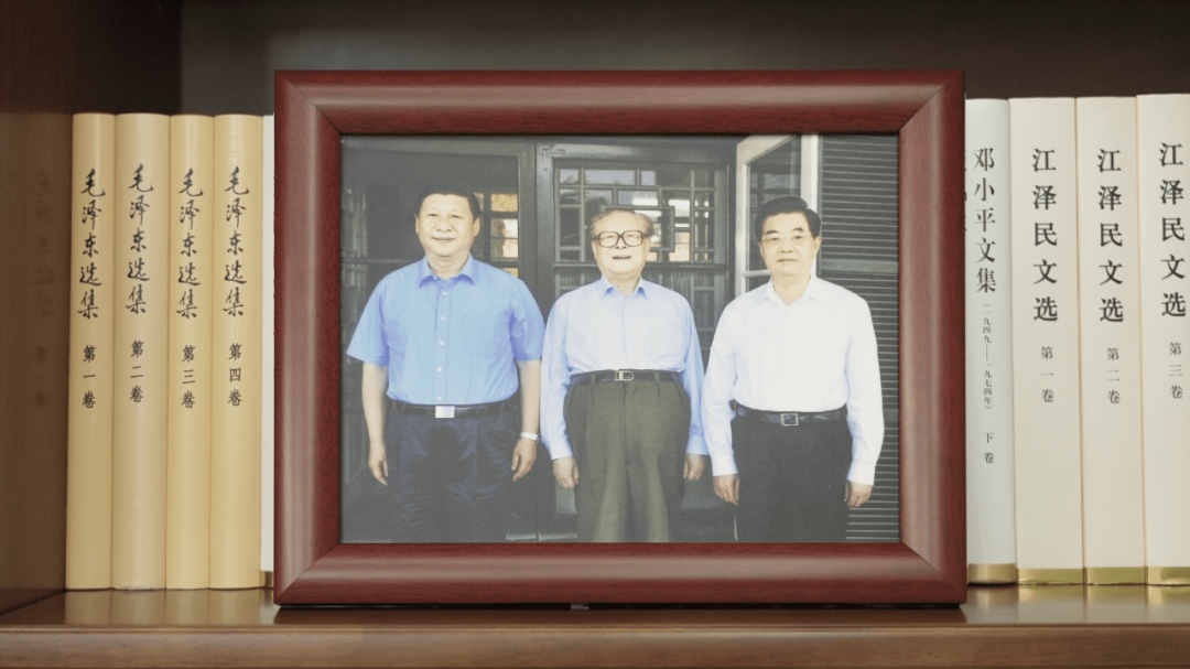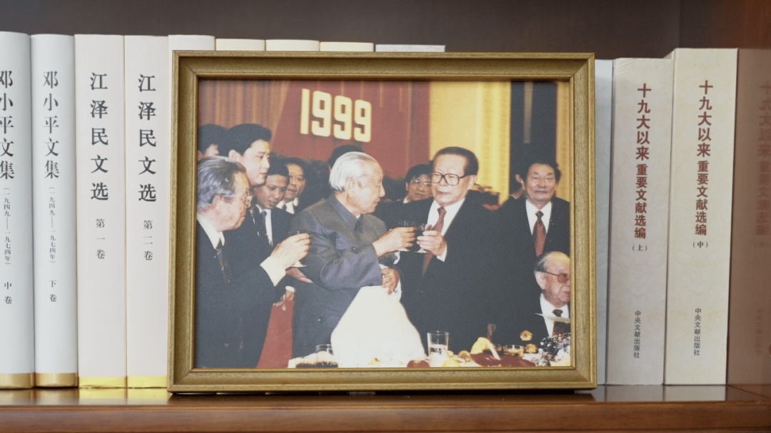 書架上擺放著一張合影。這是1999年9月30日,江澤民同志、朱镕基同志、習仲勛同志在慶祝建國五十周年招待會上。這張照片第一次出現(xiàn)在習近平總書記的書架上。