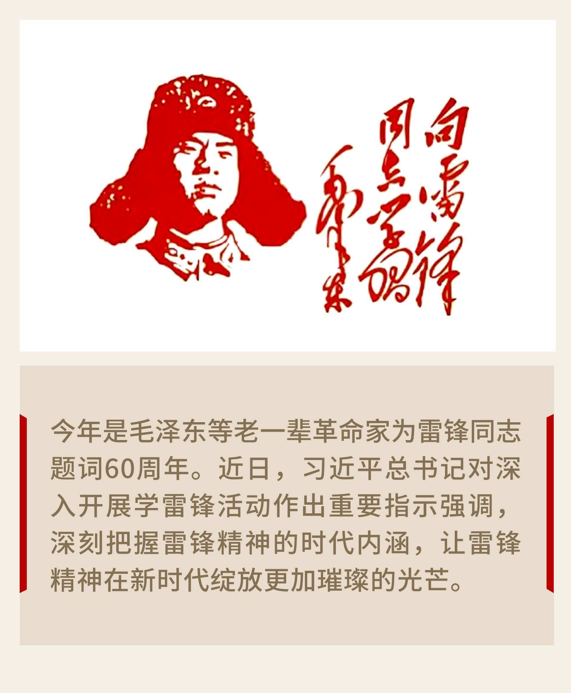 1963年3月5日,毛澤東“向雷鋒同志學習”題詞發(fā)表。隨后,劉少奇、周恩來、朱德、鄧小平等老一輩革命家也相繼題詞,發(fā)出學習雷鋒的偉大號召。
