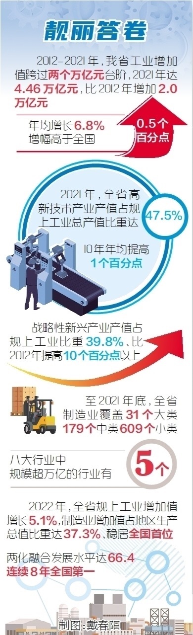 制造業(yè)規(guī)模實(shí)力保持領(lǐng)先。我省把制造業(yè)高質(zhì)量發(fā)展擺在更加突出位置,加快傳統(tǒng)產(chǎn)業(yè)轉(zhuǎn)型和戰(zhàn)略性新興產(chǎn)業(yè)發(fā)展,推進(jìn)產(chǎn)業(yè)邁向中高端水平。工業(yè)增加值10年跨過(guò)3萬(wàn)億、4萬(wàn)億兩個(gè)臺(tái)階,2021年達(dá)4.46萬(wàn)億元,比2012年增加2.0萬(wàn)億元,年均增長(zhǎng)6.8%,增幅高于全國(guó)0.5個(gè)百分點(diǎn)。